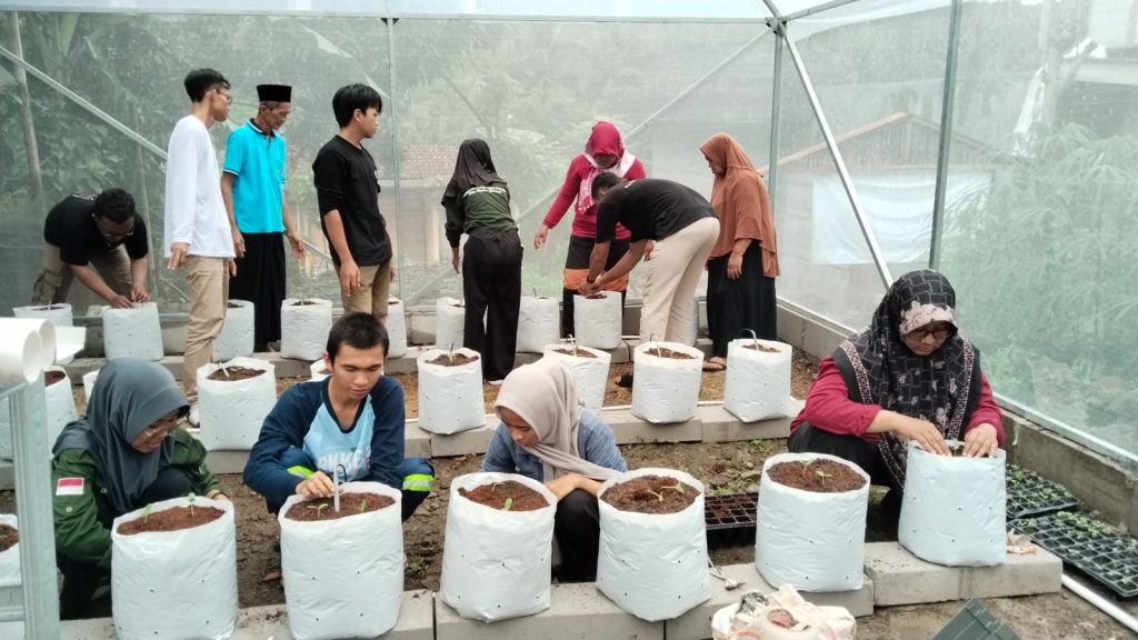 Setelah sesi teori, para peserta langsung menuju greenhouse PkM UMNU Kebumen di Desa Sendangdalem untuk praktik lapangan. Mereka belajar mengolah media tanam cocopeat, menanam bibit melon dan semangka yang sudah disemai, hingga mencoba sistem irigasi tetes secara langsung.