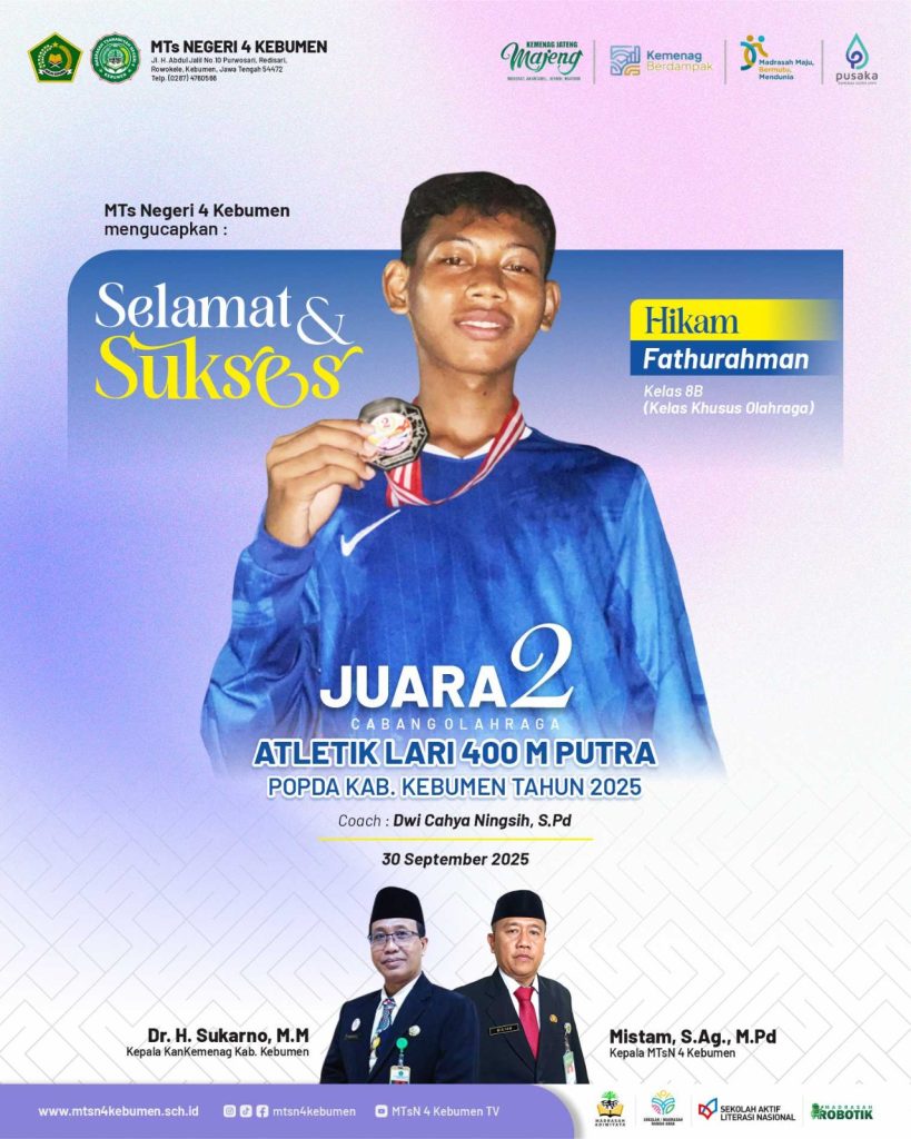 “Prestasi ini menjadi bukti nyata bahwa siswa-siswi MTsN 4 Kebumen mampu bersaing dan menunjukkan potensi luar biasa di tingkat daerah. Semoga keberhasilan Hikam bisa menjadi motivasi bagi siswa lain untuk terus berprestasi, baik di bidang akademik maupun nonakademik.”